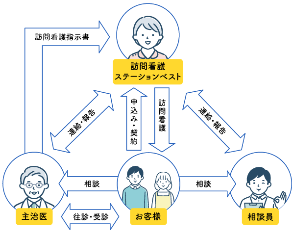 初回訪問時までにかかりつけ医、ケアマネジャーなどと連携し、訪問看護指示書の依頼を行います。